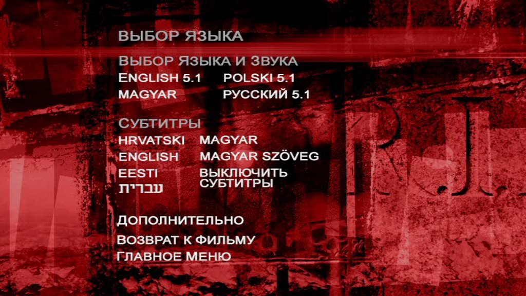 Аудио: Русский (AC3, 2 ch, 192 Кбит/с), (AC3, 6 ch, 384 Кбит/с), (AC3, 6 ch, 448 Кбит/с), (DTS, 6 ch, 755 Кбит/с), (DTS, 6 ch, 1509 Кбит/с), украинский (AC3, 2 ch, 192 Кбит/с), английский (DTS, 6 ch, 1509 Кбит/с), (AC3, 6 ch, 448 Кбит/с)