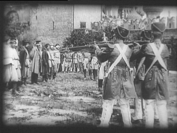 «Юбилейная историческая картина Отечественной войны в 4-х частях» - так гласит афиша. Марсельеза, «1812 год» Чайковского, военные марши - за экраном. На экране - длинный ряд картин с Наполеоном, Кутузовым, Ростопчиным и др. Режиссеры заметно тяготеют к известным картинам Верещагина из эпохи двенадцатого года, а «Военный совет в Филях» - точное воспроизведение картины Кившенко.
