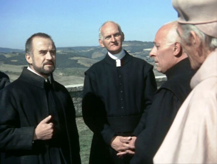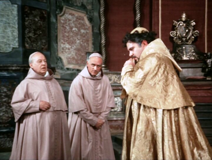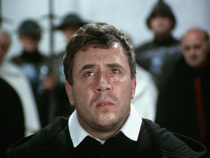 После сожжения Джордано Бруно в 1600 году Галилей сам открыл, что именно солнце находится в центре, а не земля, которая движется вокруг солнца. Церковь считает эту теорию Галилея ересью, но он продолжает свои исследования во Флоренции, пока его не арестовывают. В 1633 году он предстал перед инквизицией. Галилей был осуждён к тюремному заключению на срок, который установит Папа. Его объявили не еретиком, а «сильно заподозренным в ереси»; такая формулировка также была тяжким обвинением, однако спасала от костра. После оглашения приговора Галилей на коленях произнёс предложенный ему текст отречения. Инквизиция следила за пленником до конца его жизни; даже при кончине Галилея присутствовали два её представителя... Фильм снят в лучших театральных традициях, на которые равнялись те же Феллини с Пазолини, но при этом весьма динамичен и совсем не затянут. Идеально передан образ католического священника - служителя культа смерти. И как это раньше никто не замечал, что они некроманты? В черных рясах, на фоне гробов, отрекшиеся от любви и блаженства бытия, заставляющие всех пить человеческую кровь и есть человеческое мясо, поклоняться месту убийства - кресту, а в те времена еще и активно избавлявшиеся от непокорных - это же сама смерть в самом мрачном своем обличье... На этом фоне весьма талантливо показана фигура самого Галилео. Над ним всегда висела тень Коперника и Джордано Бруно, и он хотел жить, даже тогда, когда это не имело больше смысла. Он сопротивлялся давлению, но затем на него надели белый колпак, поставили на колени и заставили покаяться. И в этот момент совершенно четко понятно, что его оправдание ничего ему не даст, кроме нескольких лет малоспокойной жизни. Глядя на всех этих монстров в рясах в фильме Кавани невольно назревает вопрос: можно ли реально остаться нормальным человеком, сознательно лишив себя секса, любви, радостей жизни и подчинившись требовательному иссушающему эгрегору, который превращает еще мыслящего вчера человека в марионетку. Как например это случилось с другом Галилео папой Урбаном VIII, который предал Галилео при первой возможности (Cymbaline).
