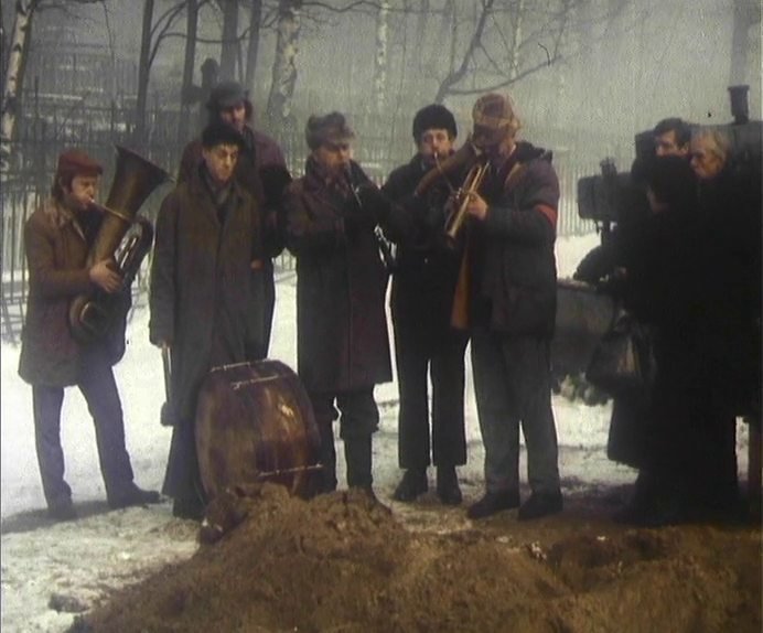 Барабан «Страдивари», унаследованный барабанщиком похоронного Оркестра, сопровождает его и в хорошие и в плохие времена, когда тот становится безработным и бесцельно странствует по Советскому Союзу. Выпив с музыкантами, барабанщик соглашается играть на похоронах и подключается к оркестру.
