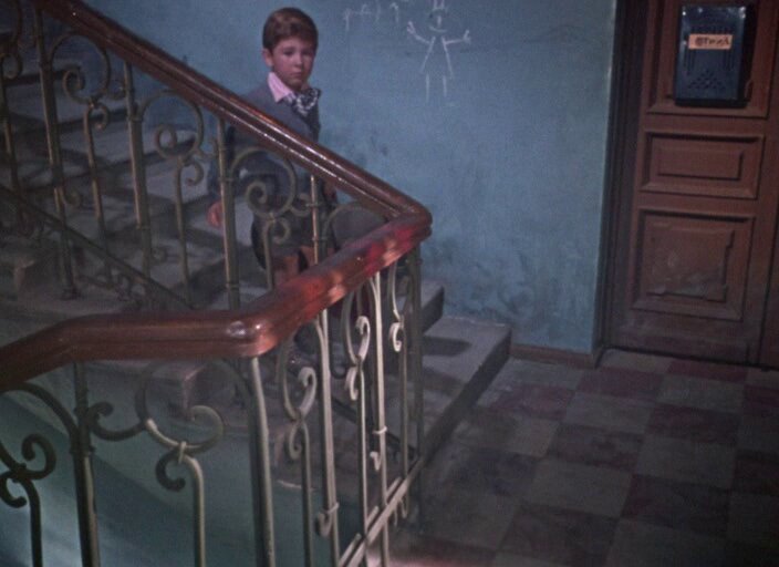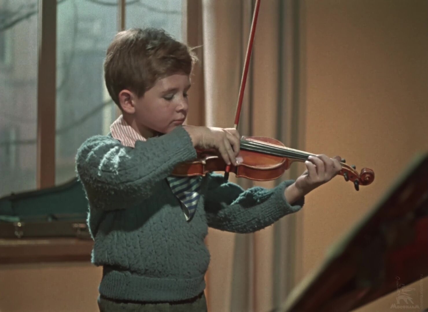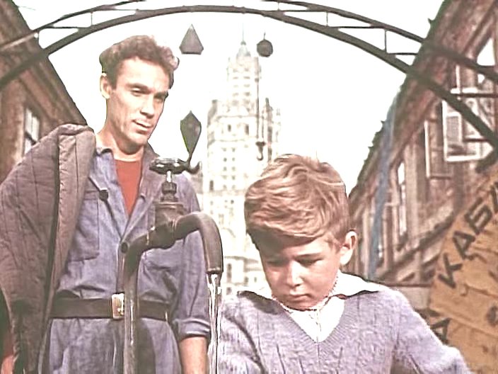 Первый дипломный фильм всемирно известного режиссера Андрея Тарковского («Андрей Рублев», «Зеркало», «Солярис», «Сталкер» и др.). Сентиментальный импрессионистический рассказ о мальчике, скрипке и асфальтовом катке. История разыгрывается в течение нескольких часов во дворе старого московского дома. В доме, где-то на четвертом или пятом этаже, живет маленький мальчик Саша лет семи, который учится играть на скрипке. Перед «музыкантом», как зовет его местная шпана, каждое утро встает трудная задача: пересечь двор под перекрестными издевательствами этой самой шпаны. На этот раз ему везет: двор асфальтируют, и водитель веселого и шумного красного асфальтового катка Сергей вступается за карапуза. Он устыжает шпану (снятую, впрочем, достаточно условно, лишь как фон действия) и дает «музыканту» поработать на катке. Спокойный и немного грустный, Сергей так годится Саше в отцы, ведь у него можно узнать ответы на настоящие мужские вопросы: «Страшно ли на войне?» или «Что лучше — сигареты или папиросы?». Да и у молодого рабочего есть вопросы к мальчику, например, «Сколько лет надо учиться играть на скрипке?». Так начинается дружба двух мужчин, большого и маленького. Дружба, которая продлится каких-нибудь полдня и даже превратится в «треугольник». За их отношениями будет ревниво следить девушка с соседнего — желтого — катка, которая грубовато заигрывает с водителем.