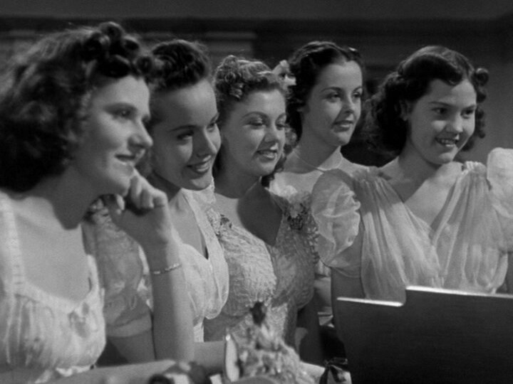 Дина Дурбин ("Леди в поезде", "Сестра его дворецкого") и Роберт Стэк ("Аэроплан!", "Необычайная отвага") в романтической музыкальной комедии "Первый бал"...После окончания школы-интерната сирота Конни попадает в дом своих богатых, но очень неприветливых родственников...Так начинается история современной американской "Золушки", которая, как и положено закончится счастливым концом и встречей героини с настоящим принцем. Первая любовь, наконец, пришла и к героине Дины Дурбин. Вся Америка с волнением ждала выхода этого фильма на экраны. И, конечно же, первого робкого поцелуя их любимицы...Картина имела огромный кассовый успех. Зрители выстаивались в гигантские очереди у кинотеатров ради незабываемой встречи с привлекательной Диной. Обладая очаровательным голосом, она сумела покорить сердца людей во всем мире. В советском прокате, где фильм шел под названием "Первый бал", поцелуй был целомудренно вырезан.