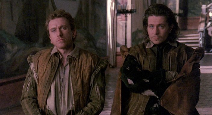 Блестящая лента Тома Стоппарда, в которой он с воистину британским юмором наводит зрителя на философские размышления о сущности бытия, используя для этого вывернутого наизнанку "Гамлета" Вильяма Шекспира. В ролях лучшие из английских актеров – Тим Рот и Гарри Олдмэн – разыгрывают странную и, вместе с тем, смешную историю, поставленную, кстати, по всем законам театра, в которой главные герои шекспировского "Гамлета" становятся второстепенными, второстепенные - главными, сюжетные линии Шекспира – не существенными, а события, о которых Шекспир и не упоминал, – достоянием зрителя.
