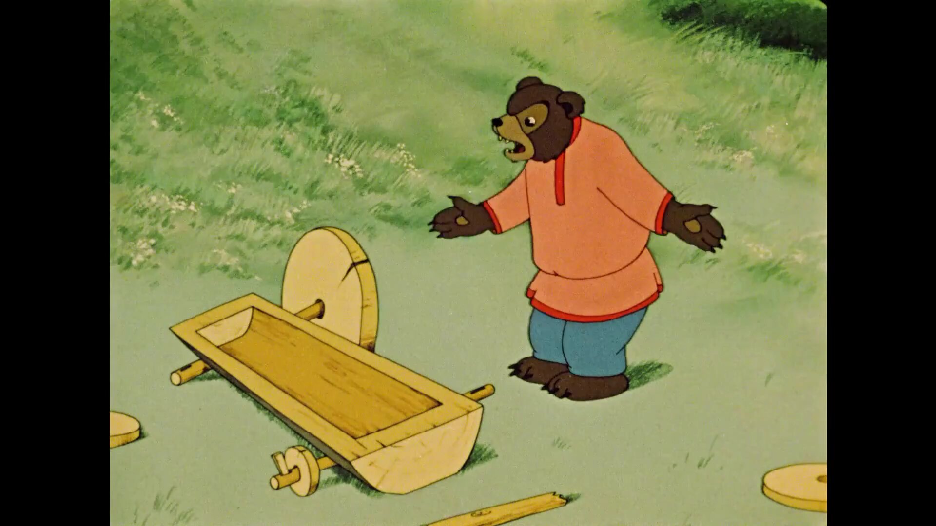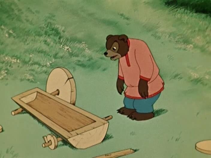 Мультипликационный фильм о том, как трудолюбивые и зобретательные жители теремка: петушок, ежик, лягушка и муха нашли в лесу оброненную медведем телегу с разными колесами и сделали из них много полезных вещей.