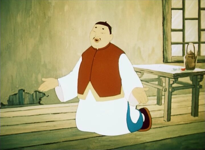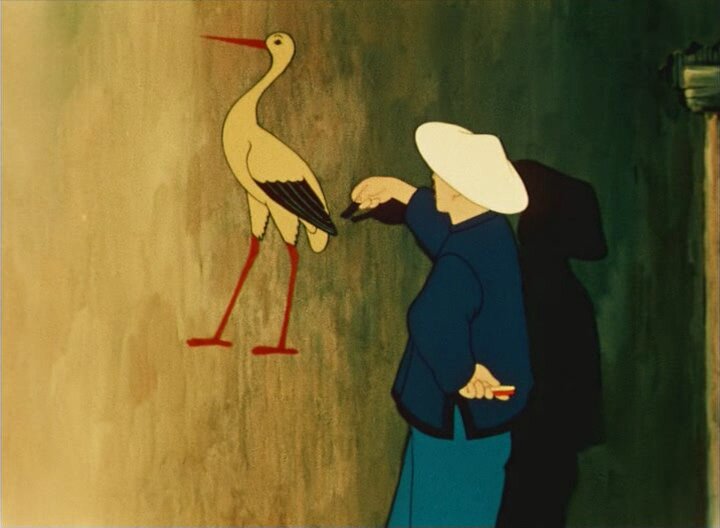 Старинная китайская сказка о бродячем музыканте Ми повествует о временах, когда Китаем управляли жестокие и жадные мандарины. Ми чудесно играл на флейте и не кланялся вельможам, а только хорошим людям, занимавшимся трудом. Мандарин возмутился и велел отрубить ему голову, но хитрый Ми убежал. Уходя и прощаясь, для своих друзей на стене харчевни он нарисовал желтого аиста, который должен был танцевать под музыку только для трудового народа и никогда для господ. Мандарин велел поймать птицу, но та превратилась в рисунок на стене…