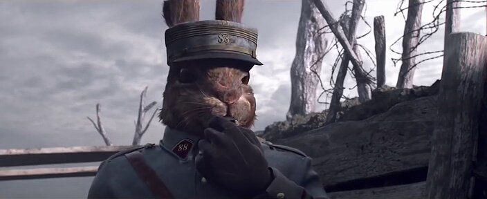Во французских окопах царит спокойствие. Пехотинцы ждут команды выйти на поле боя. Среди них — молодой заяц Фердинанд, играющий на губной гармошке. Дан свистящий сигнал, начинается атака. На поле битвы Фердинанд впервые сталкивается со своим врагом, ужасным существом.