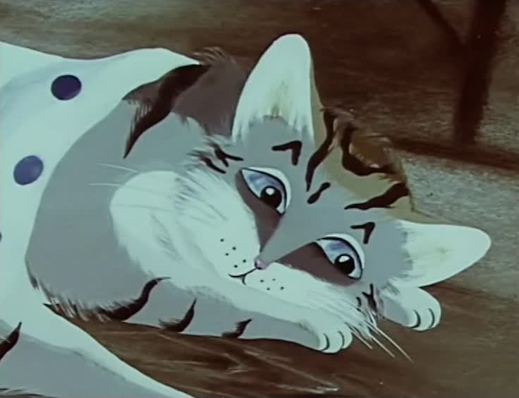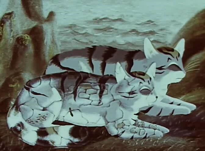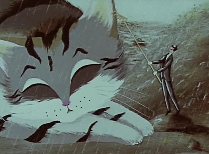 По сказке Дж. Эйкен "Кот булочницы". Кот поел дрожжей и непомерно вырос. Жители городка стали его бояться. Но Кот спас город от наводнения, и горожане поняли, что он остался таким же добрым, каким был и раньше.