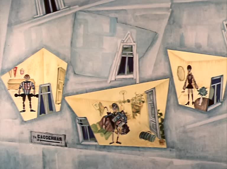 По одноименному стихотворению Самуила Яковлевича Маршака. В произведении в юмористической форме рассказывается о поездке рассеянного человека с улицы Бассейной в Ленинграде, в Москву. Сначала он надевает вместо своей одежды чужую и совершенно неподходящие в качестве одежды вещи, затем едет на вокзал на крыше трамвая, и в конце концов двое суток сидит в отцепленном вагоне полагая, что едет из Ленинграда в Москву.