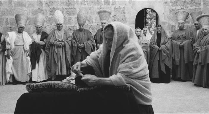 В полудокументальной манере с использованием непрофессиональных актеров в черно-белом изображении рассказывается о жизни Иисуса Христа. Сценарий написан по Евангелию от Матфея. Иисус в изображении Пазолини кажется гневным, он как бы торопится, быстро и отчетливо выговаривая канонический текст, словно осознавая, что времени у него мало.
