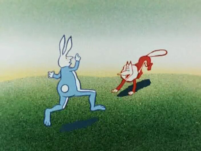 Мультипликационный фильм, на всем своем протяжении показывающий погоню Лисы за Зайцем. Весь юмор ситуации заключается в том, что за этим занятием герои дружественно беседуют на различные философские и жизненные темы. К концу фильма Лиса устаёт и начинает жаловаться на жизнь Зайцу. Добрый Заяц пожалел Лису и начал её убеждать в том, что жизнь не так уж плоха, просто нужно быть более уверенным в себе и сказать «Я могу! Я умею!». Лиса вняла совету Зайца и убедила себя в своих силах, что помогло ей поймать Зайца и съесть его. Заяц пострадал из-за своей доброты и тем самым сам встал на свой смертный путь.